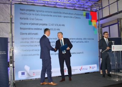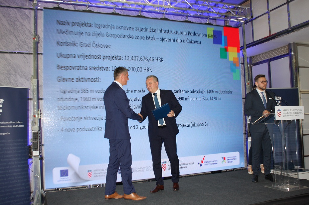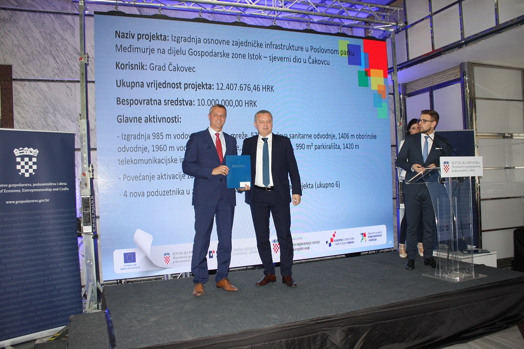Na prigodnoj svečanosti koja je u petak prijepodne održana u prostorijama Ministarstva gospodarstva u Zagrebu, načelnicima i gradonačelnicima 46 hrvatskih jedinica lokalne samouprave, uručene su Odluke o financiranju, temeljem natječaja „Razvoj infrastrukture poduzetničkih zona“. Čakovec je jedini među njima dobio maksimalni previđeni iznos, 10 milijuna kuna.