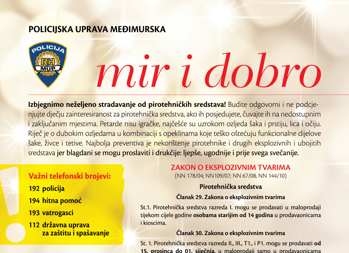 Kao i proteklih godina, s ciljem povoljnog održavanja stanja javnog reda i mira, te opće sigurnosti građana povodom božićnih i novogodišnjih blagdana i ove godine Ministarstvo unutarnjih poslova provodi operativnu akciju „MIR I DOBRO“, a koju Policijska uprava međimurska na svom području provodi u vremenu od 15. prosinca 2014. godine do 08. siječnja 2015. godine.