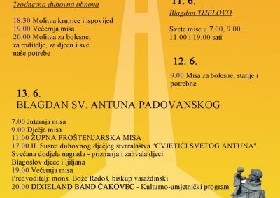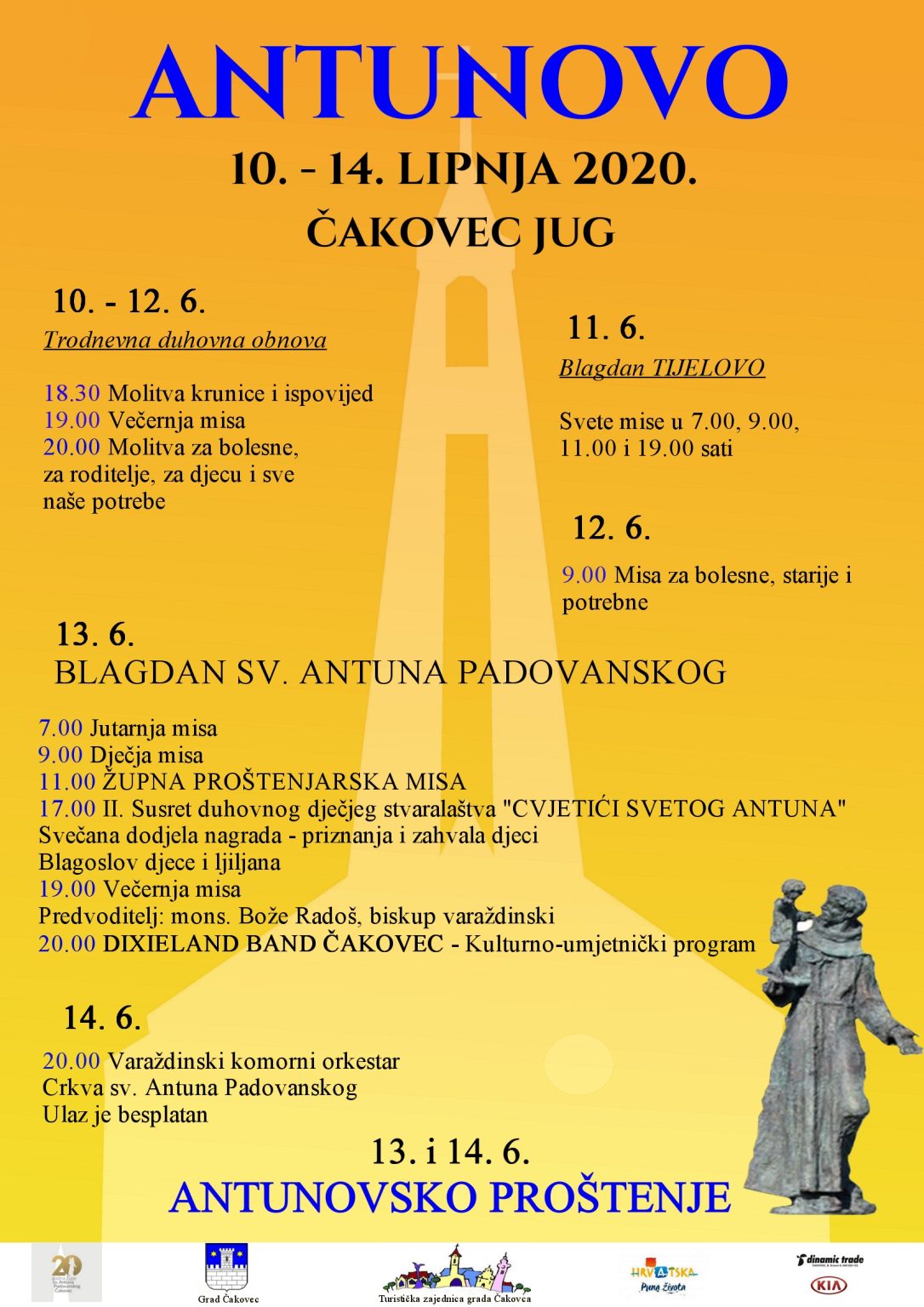 Turistička zajednica grada Čakovca u suradnji s Gradom Čakovcem i Župom sv. Antuna Padovanskog Čakovec – jug organizira manifestaciju “Antunovsko proštenje” koja će se na jugu Čakovca održati od 10. do 14. lipnja 2020. godine.