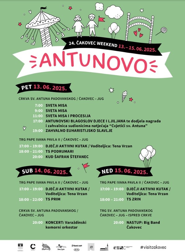 Organizatori srdačno pozivaju sve građane i posjetitelje da im se pridruže, provedu kvalitetno vrijeme sa svojim najmilijima i zajedno proslave blagdan sv. Antuna u duhu tradicije, vjere i zabave! Ne propustite Antunovsko proštenje – savršen početak ljeta u Čakovcu!