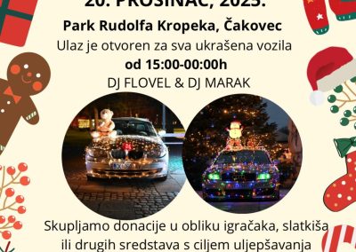 20.prosinca 2025. (subota) postaje dan u kojem će Park Rudolfa Kropeka postati prava mala božićna bajka ispunjena prigodno ukrašenim i obasjanim automobilima. Osim druženja za sve ljubitelje automobila, ovaj događaj nosi i svoju humanitarnu stranu. Cilj susreta je uljepšati božićne blagdane onima najpotrebitijima i najranjivijima – djeci. U sklopu druženja prikupljat će se donacije za Udrugu Crveni Križ Čakovec, koja će osigurati poklone i ono najpotrebnije nezbrinutoj djeci te na taj način barem malo im uljepšati blagdanske dane.