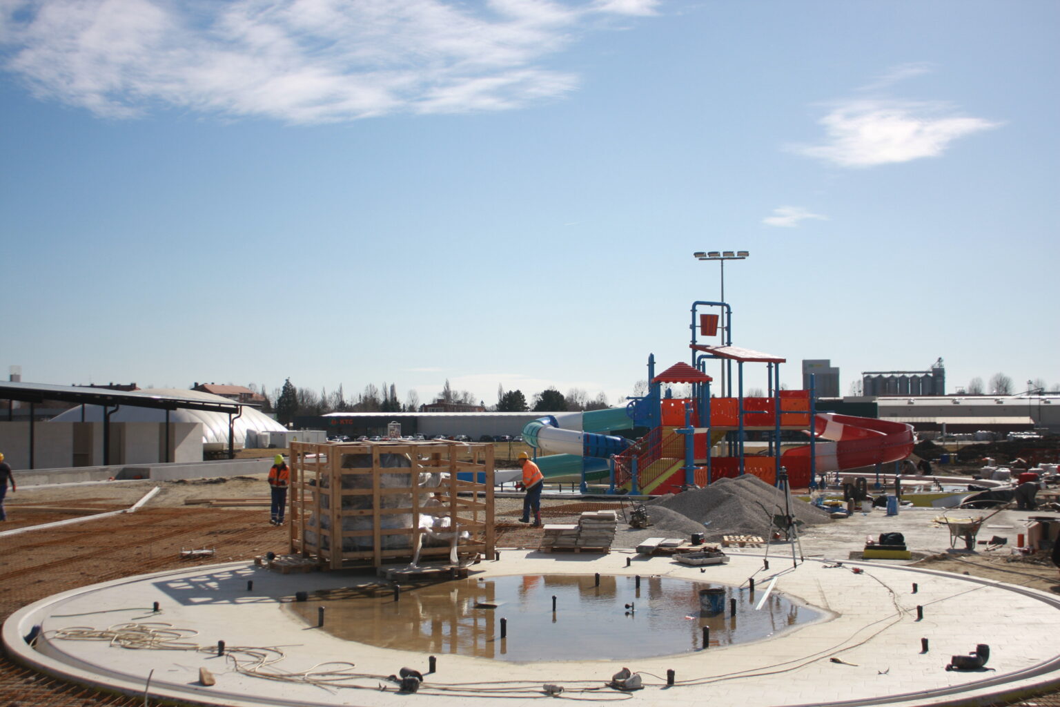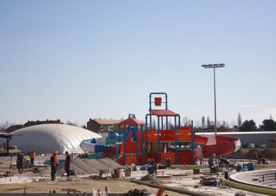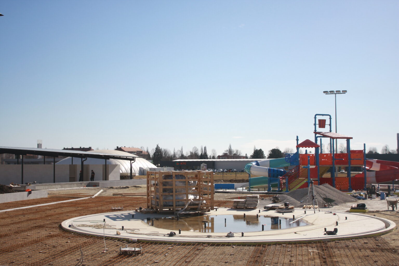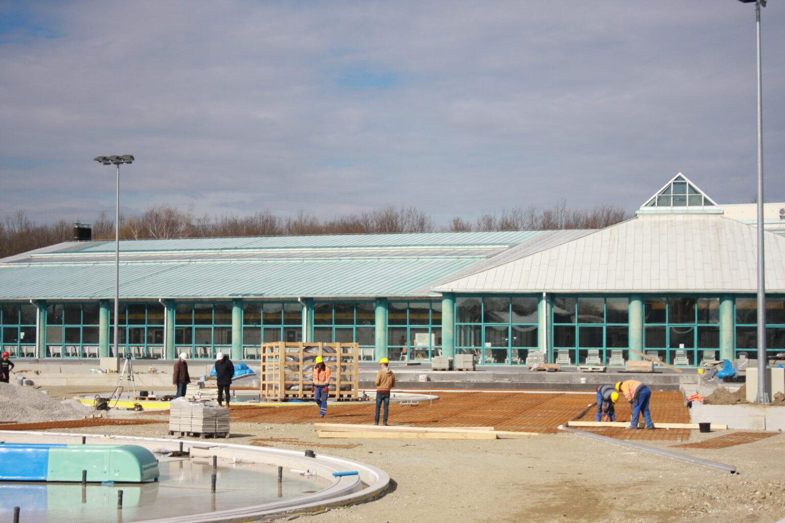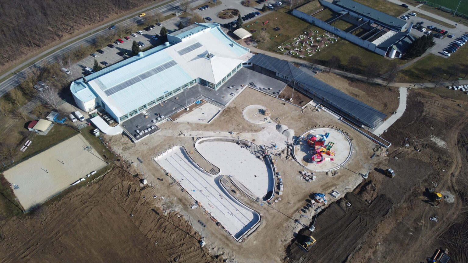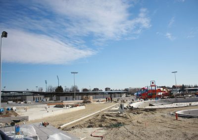 Radovi idu prema ugovorenom tijeku i većina je odrađena. Trenutno se formiraju zelena sunčališta, uređuje okoliš ulaznog kompleksa, priprema pristupna cesta, postavlja se ograda kompleksa vanjskih bazena, a u tijeku su i radovi u strojarnici, elekto radovi slabe i jake struje, spajanje i testiranje komponenti bazenske tehnike, klorne stanice i upravljačkih ormara te automatike. Nastavljeni su radovi na oblaganju rekreacijskog i plivačkog bazena keramičkim pločicama kao i uređenje sunčališta uz same bazene, na montaži sanitarne opreme, kabina, razne opreme garderoba i ureda te rasvjete bazena.