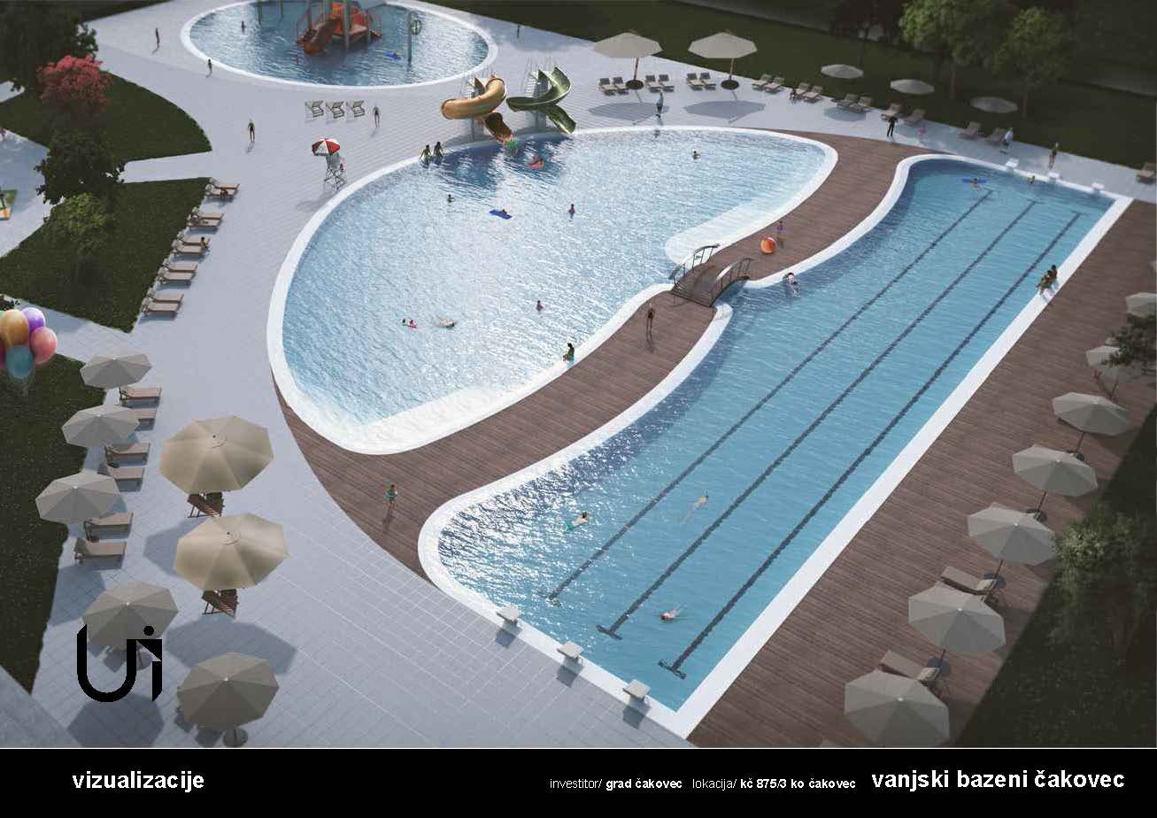 Pritom je prisjetila kako će prostor vanjskih bazena činiti četiri osnovne funkcionalne zone: “javna” zona, dječja zona, lounge zona i zona središnje vodene površine, svaka sa svojim karakterističnim sadržajima i ambijentom. U zgradi vanjskog ulaza bit će smješteni prostori blagajne, kabina za presvlačenje s garderobom, sanitarije te prostori za pružanje hitne medicinske pomoći. Glavni bazen osmišljen je kao vodena površina podijeljena u zonu za plivanje i zonu za “boravak u vodi”, međusobno povezan kanalom, preko kojeg prolazi most. Unutar zone za plivanje moguća je postavka četiri plivačke trake predviđene za plivačke treninge i rekreativno plivanje. U sklopu glavnog bazena, očekuje nas hidromasažna zona, s ležećim i sjedećim masažama, vodeni slapovi, gejziri i tobogan.