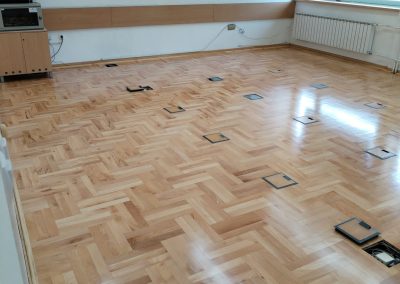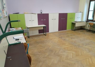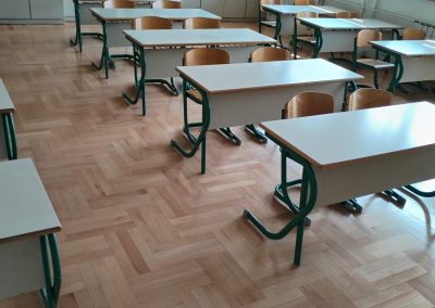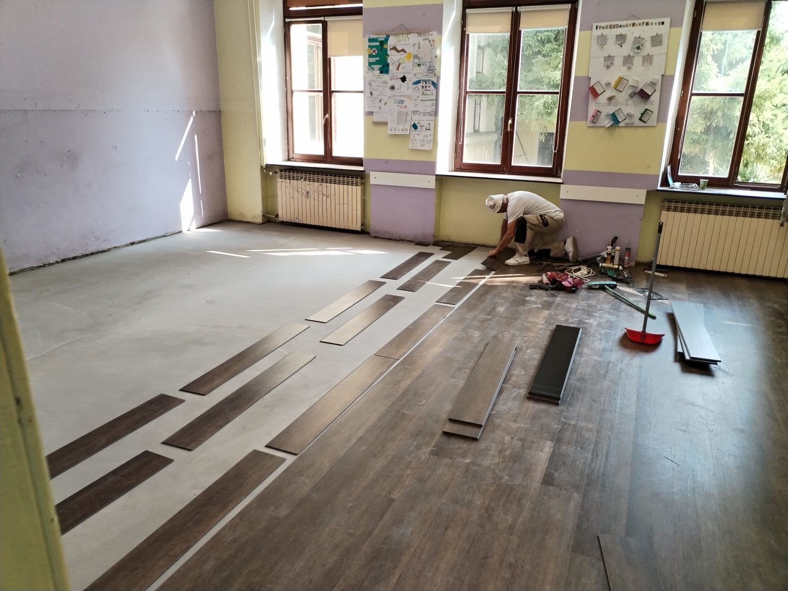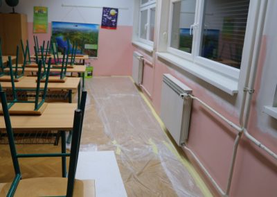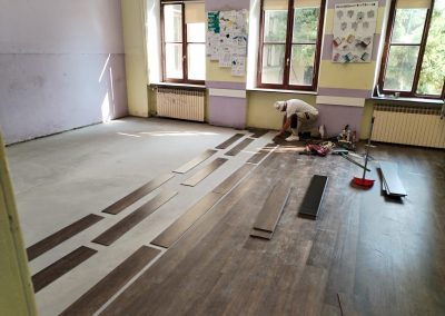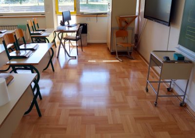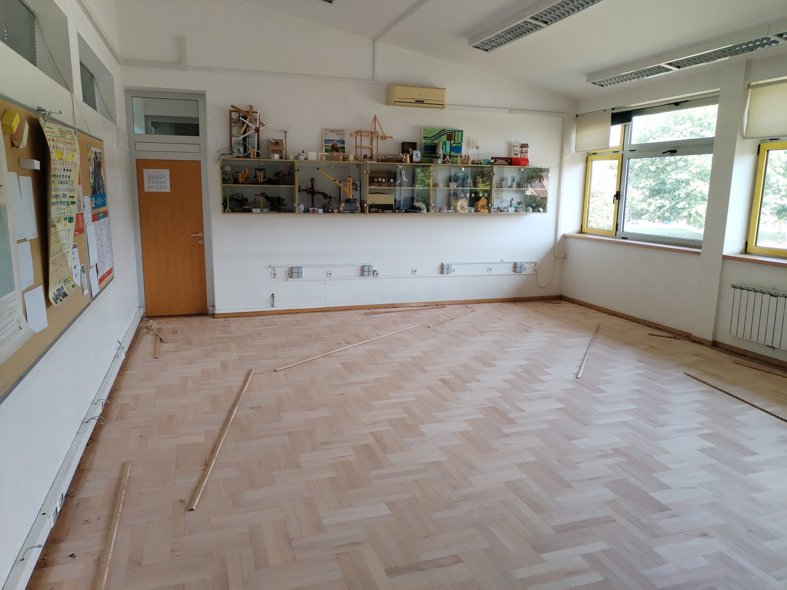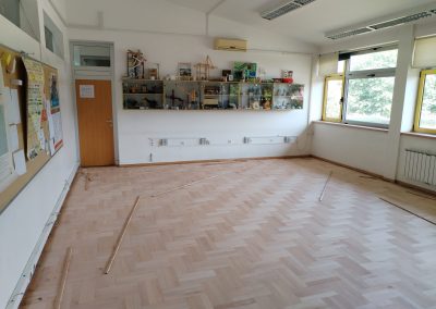 U Prvoj osnovnoj školi zamijenjen je pod u jednoj učionici (51 m2) i učiteljskom kabinetu (20 m2). Postavljeni su novi LVT podovi koji su otporni na habanje i jednostavni za održavanje, što doprinosi dugotrajnosti i funkcionalnosti prostora te je napravljena sanacija stropova nakon zamjene rasvjetnih tijela.