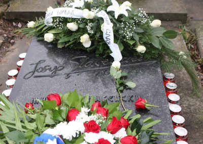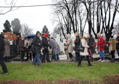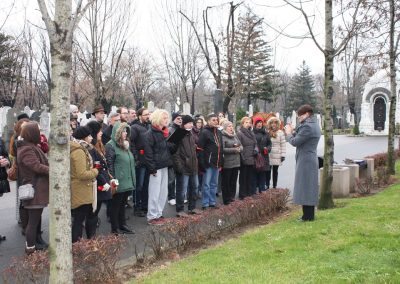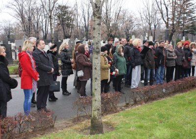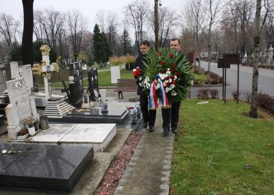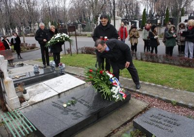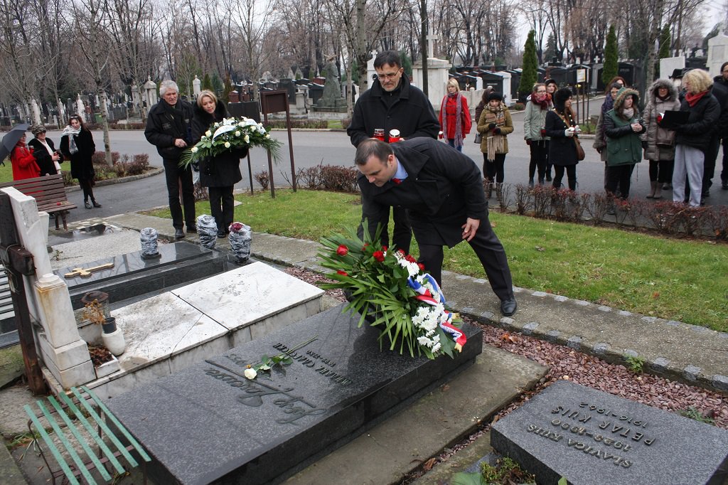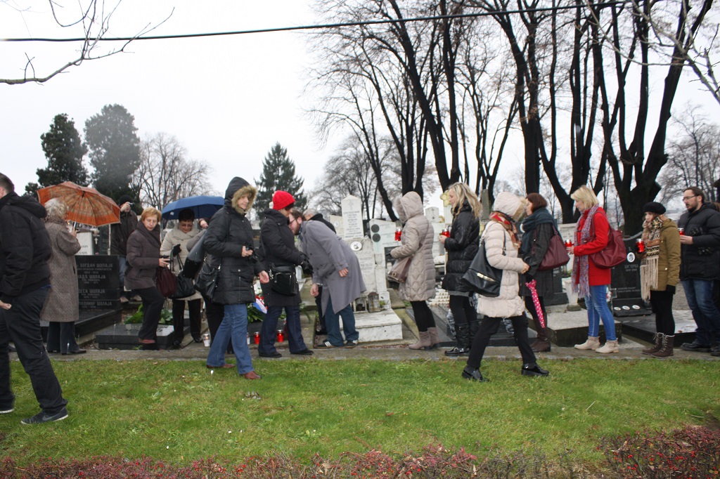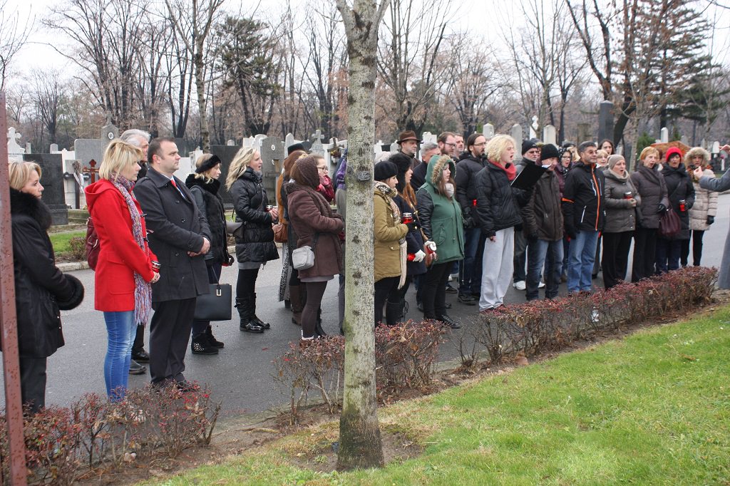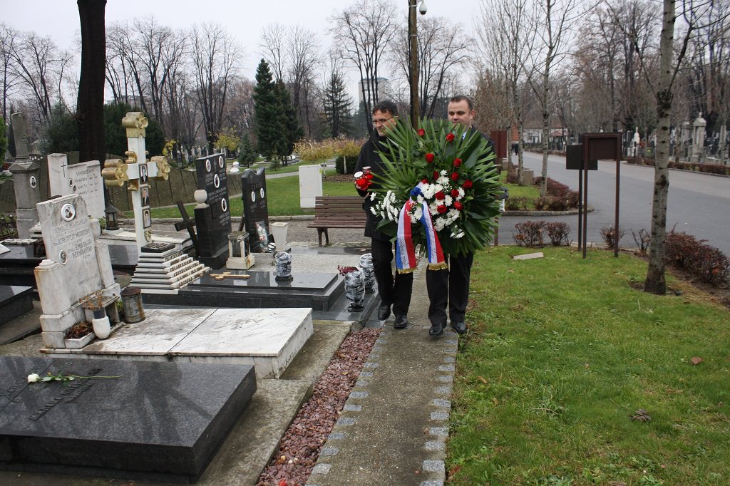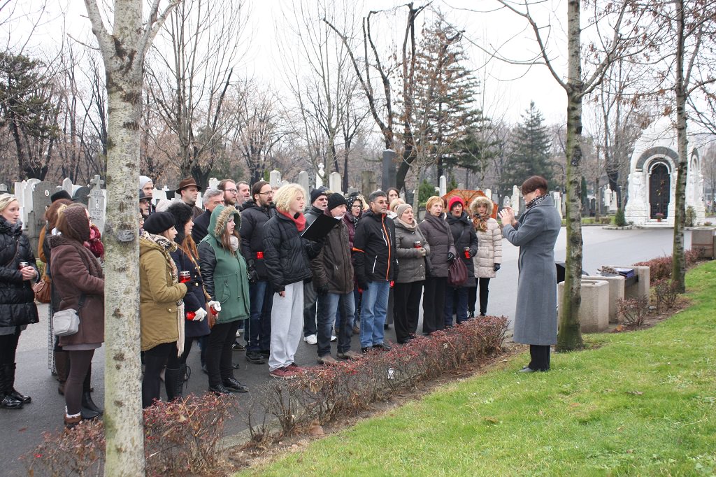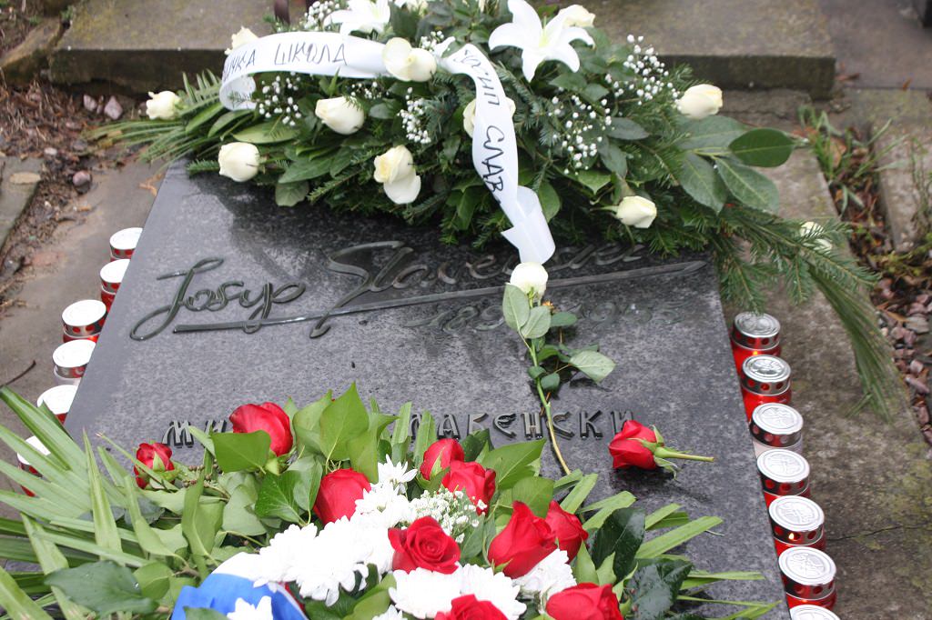 Izaslanstvo je posjetilo i skladateljev grob koji se nalazi na beogradskom Novom groblju. Vijenac su položili predsjednik Gradskog vijeća Čakovca Jurica Horvat i ravnatelj Centra za kulturu Čakovec Ladislav Varga. U čast čovjeka čije ime nosi, Zbor je pred grobom, u vrlo emotivnoj izvedbi otpjevao „Voda zvira“, inače pogrebnu pjesmu Josipa Štolcera Slavenskog.