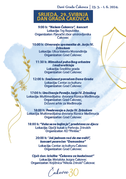 U 12 sati u Centru za kulturu u Čakovcu središnja je svečanost obilježavanja Dana Grada i 30. obljetnice postojanja Grada Čakovca u neovisnoj Hrvatskoj, na kojoj će uz domaćine, gradonačelnicu Grada Čakovca Ljerku Cividini i predsjednika Gradskog vijeća Josipa Vargu, te mnogobrojnih uzvanika i dobitnika ovogodišnjih priznanja biti prisutan i predsjednik RH Zoran Milanović.