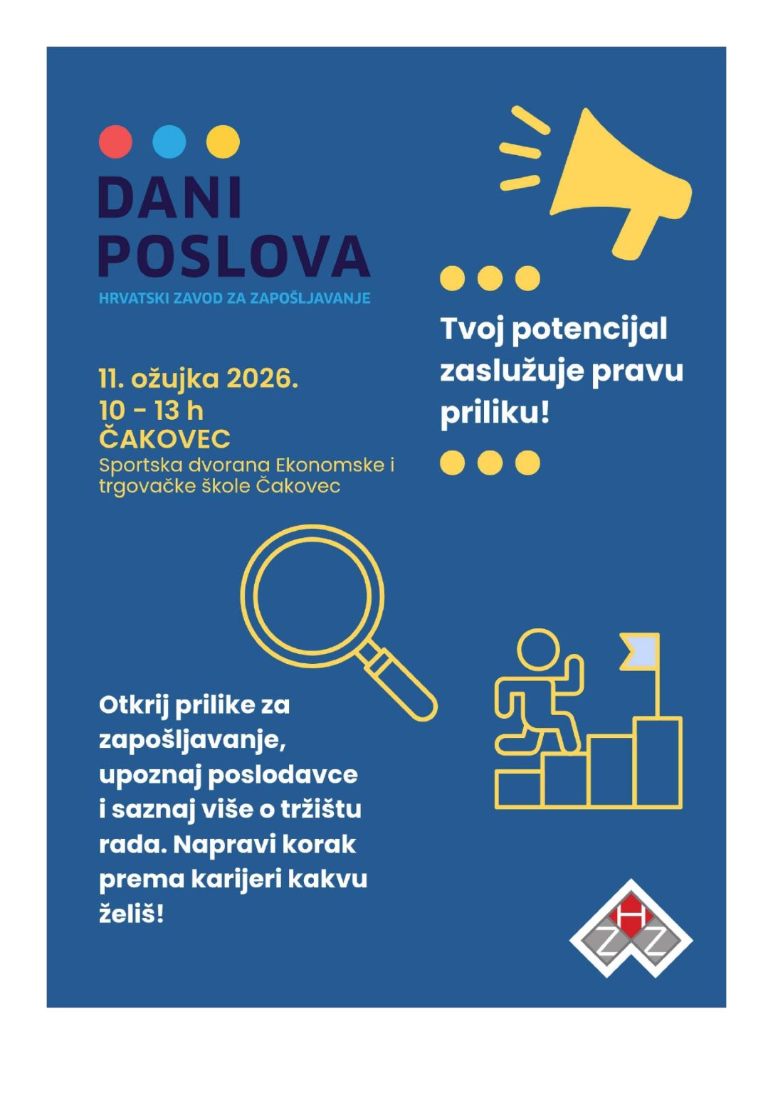 Hrvatski zavod za zapošljavanje organizira Dane poslova u Čakovcu koji će se održati 11. ožujka 2026. godine u sportskoj dvorani Ekonomske i trgovačke škole Čakovec, u vremenu od 10,00 do 13,00 sati.