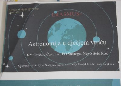Uz naglasak na popularizaciju astronomije kod djece, učili su o promatranju zvijezda, svemiru, sudjelovali na radionicama izrade nebeskih tijela i posjetili zvjezdarnicu. Odgojiteljice iz Slovenije pozdravio je i predsjednik Mjesnog odbora Miroslav Novak, ponosan što se u tamošnjem vrtiću odvija ovakav vrijedan projekt i pridružio se želji da ovaj Erasmus projekt bude samo prvi u nizu budućih kvalitetnih međunarodnih projekata.