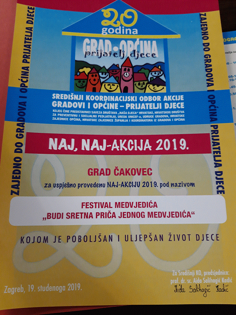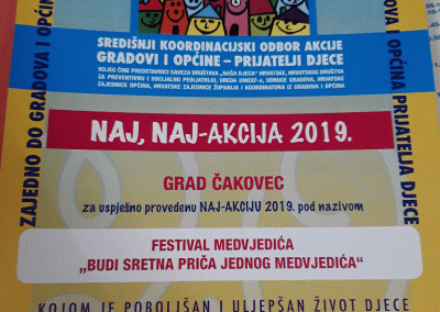 Gradovi i općine svake godine izabiru po jedan projekt koji proglašavaju Naj-akcijom te izvješće o njenoj provedbi šalju Središnjem koordinacijskom odboru akcije Gradovi i općine – prijatelji djece. U 2019. godini Koordinacijski odbor akcije Grad Čakovec – prijatelj djece za Naj-akciju je odabrao projekt Budi sretna priča jednog medvjedića, koji je provela Međimurska udruga za ranu intervenciju u djetinjstvu.