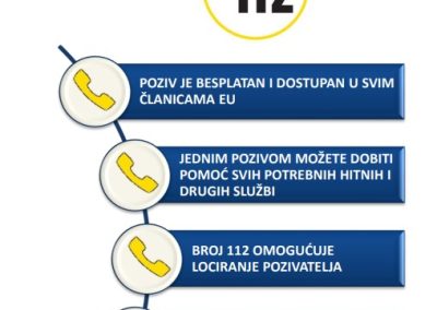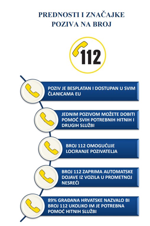 Jedinstveni broj 112 predstavlja jedinstvenu ulaznu točku za traženje pomoći u svim hitnim situacijama. Građanima i svjedocima nesreća omogućuje da jednim pozivom brzo dobiju odgovarajuću pomoć, bez potrebe razmišljanja koju službu nazvati i tko je nadležan za konkretan događaj.