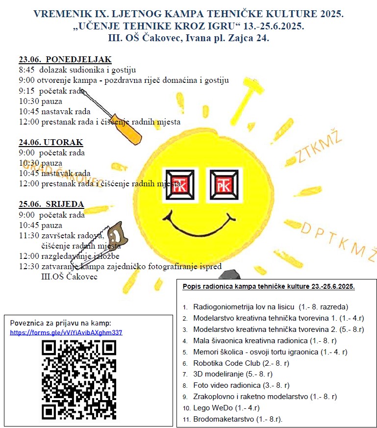 Grad Čakovec i Međimurska županija i ove godine pomažu županijskom Društvu pedagoga tehničke kulture u organizaciji 9. Ljetnog kampa tehničke kulture koji će se – za osnovnoškolce – održati od 23. do 26. lipnja u III. osnovnoj školi Čakovec.