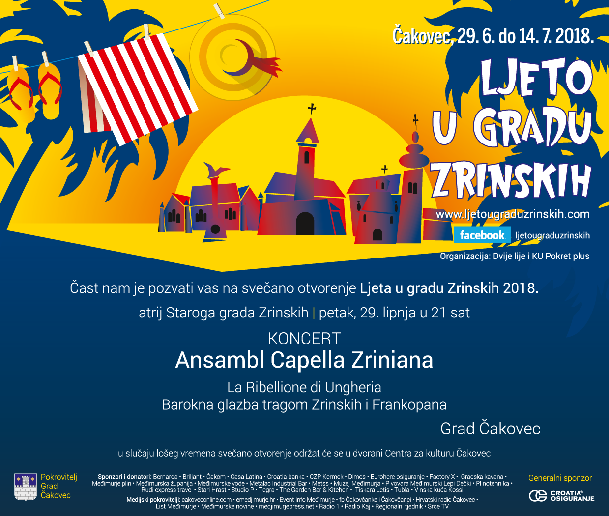 Program otvara Ansambl Capella Zriniana baroknom glazbom dok su glavna atrakcija Ljeta u gradu Zrinskih koncerti koji se održavaju u jezeru podno Starog grada, te tako u subotu 30. lipnja nastupa Edo Maajka, 7. srpnja Kawasaki 3P, a popularni Jinxi zaključiti će manifestaciju u subotu, 14. srpnja.