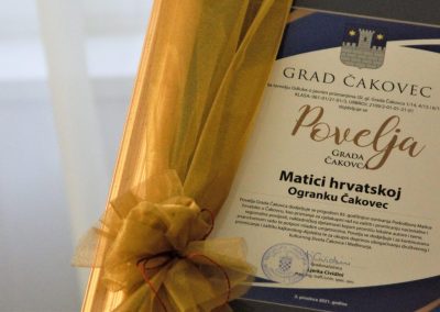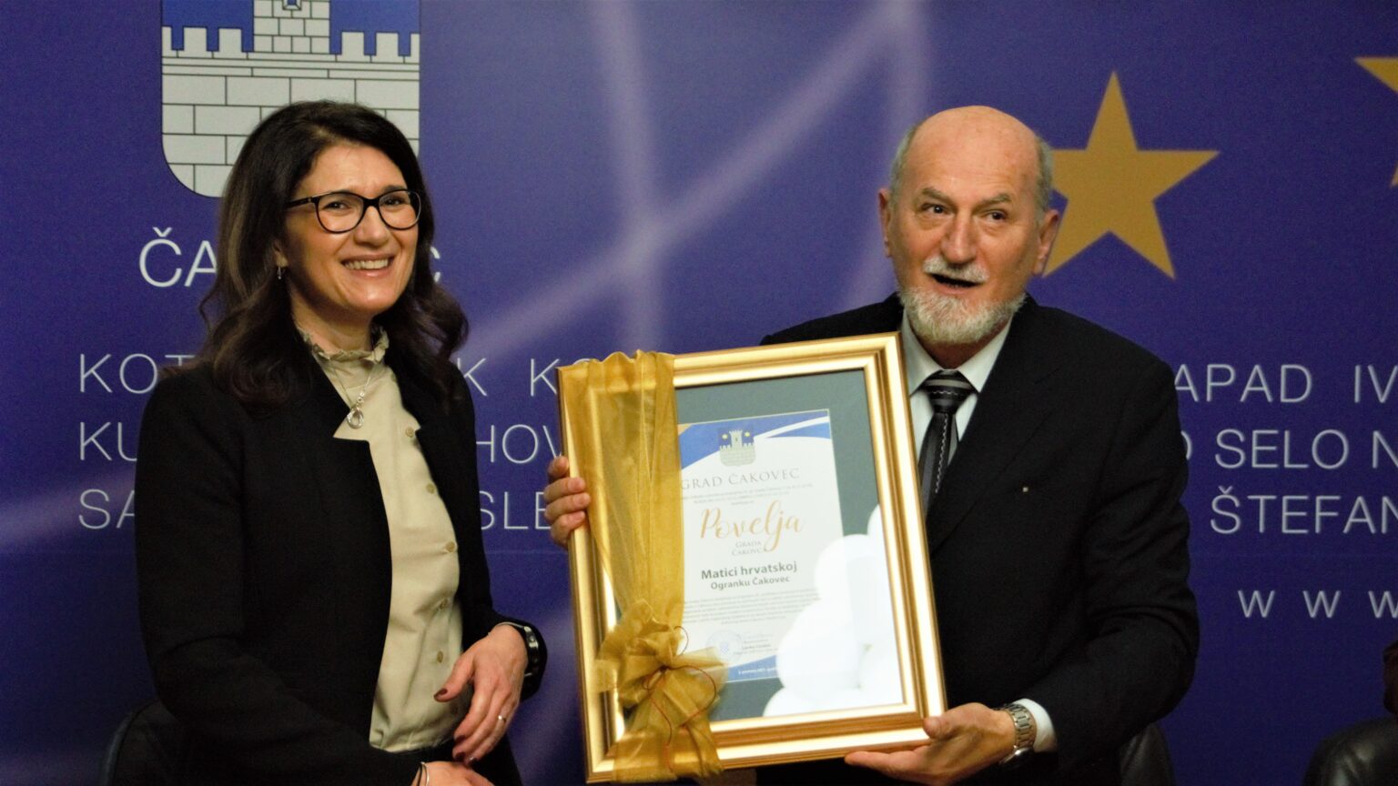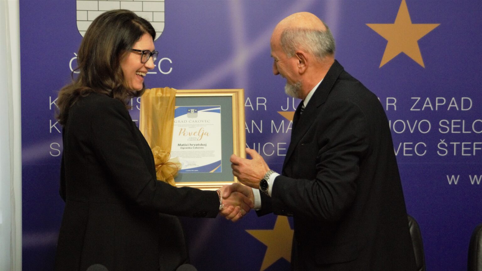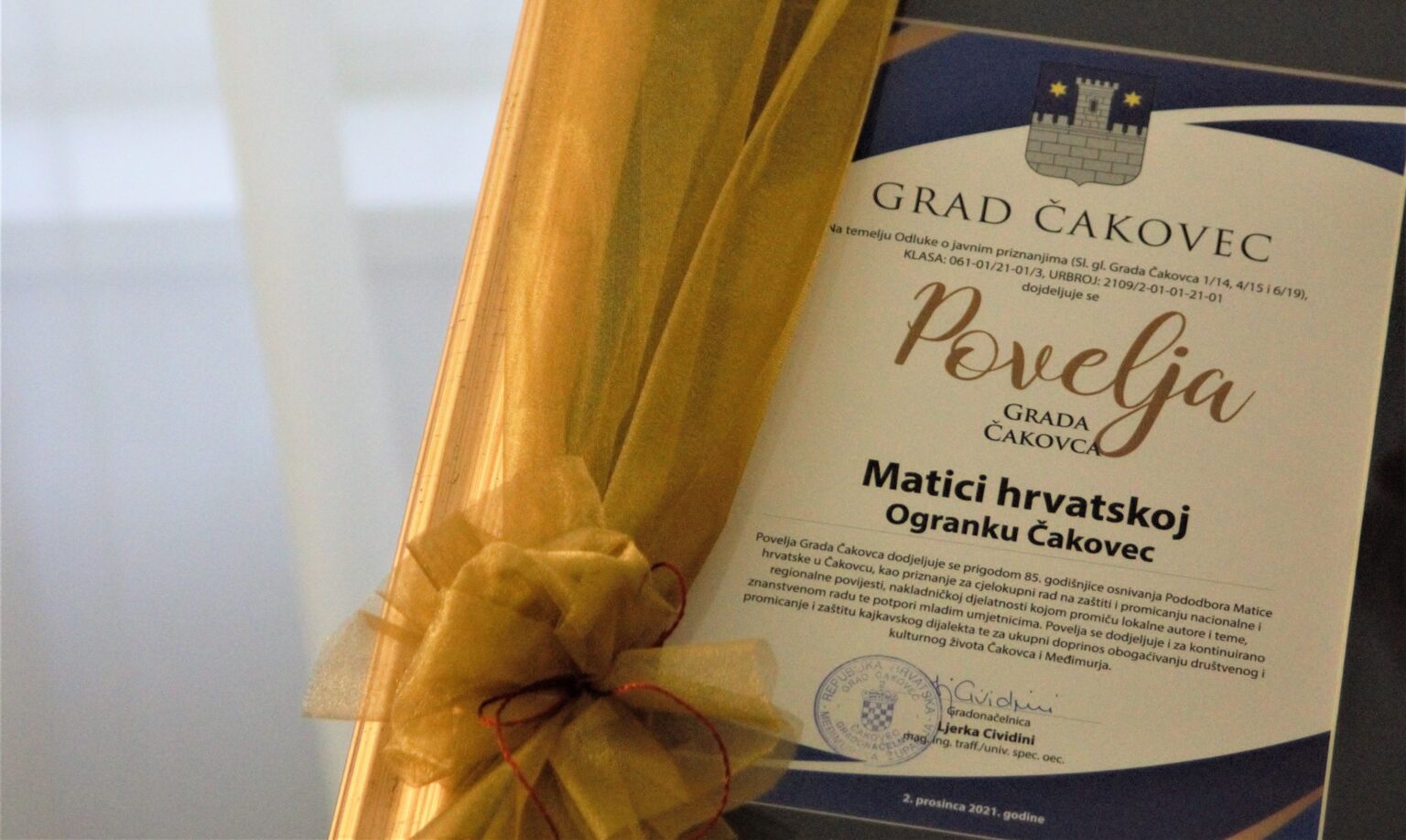 Gradonačelnica Grada Čakovca Ljerka Cividini uručila je na prigodnom prijemu Matici hrvatskoj – Ogranak Čakovec Povelju Grada Čakovca. Kako je pritom objasnila, Povelja ide u prave ruke kako se dodjeljuje prigodom 85. godišnjice osnivanja Pododbora Matice hrvatske u Čakovcu, kao priznanje za cjelokupni rad na zaštiti i promicanju nacionalne i regionalne povijesti, za nakladničku djelatnost kojom promiču lokalne autore i teme, znanstveni rad te svesrdnu potporu mladim umjetnicima. „Povelja se dodjeljuje i za kontinuirano promicanje i zaštitu kajkavskog dijalekta te za ukupni doprinos obogaćivanju društvenog i kulturnog života Čakovca i Međimurja“, rekla je gradonačelnica.