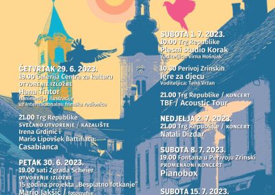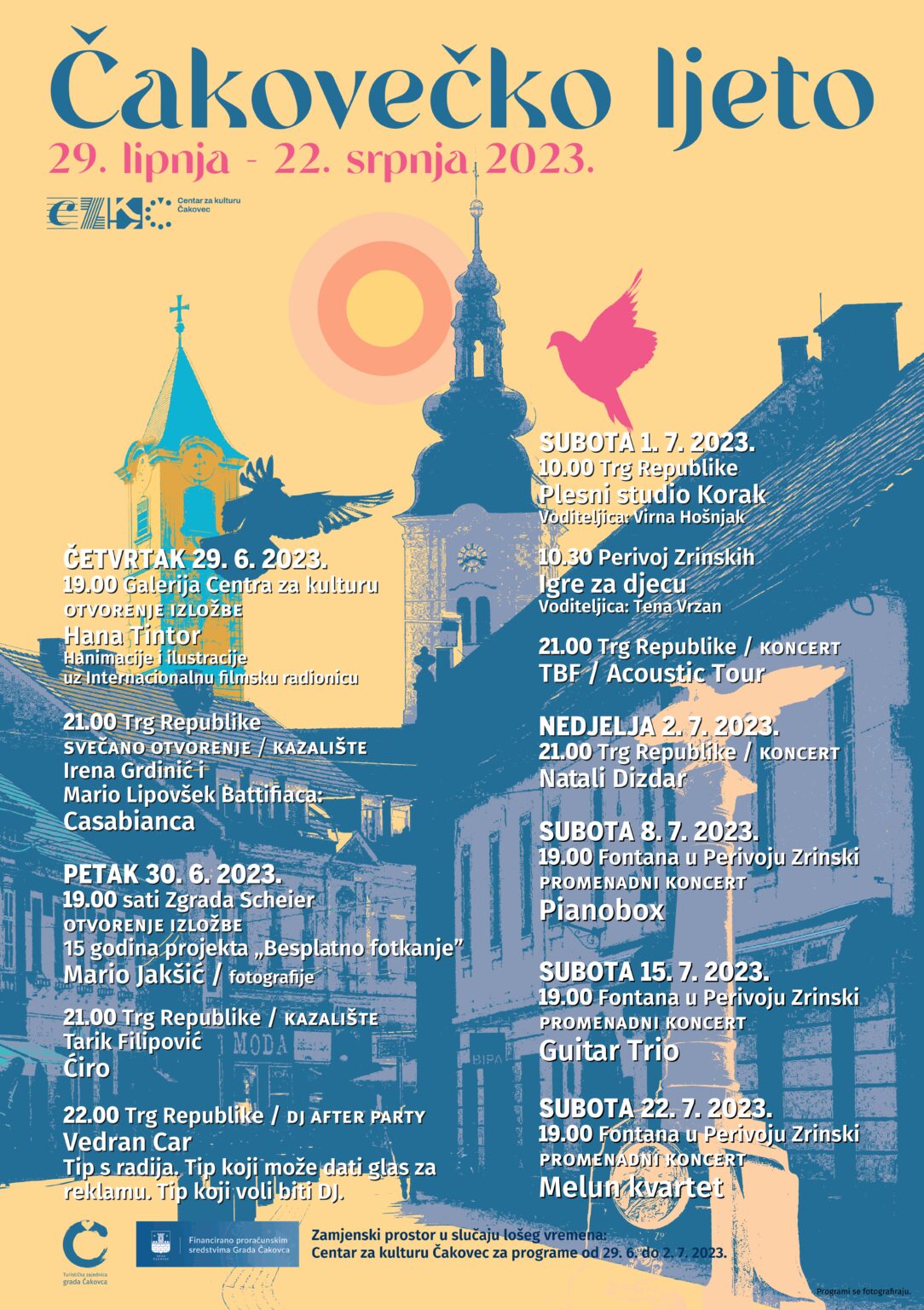 Skoro mjesec dana Čakovec će biti centar ljetnih zbivanja, a program se otvara u Galeriji čakovečkog CZK-a izložbom Hane Tintor, nastavlja kazališnim izvedbama, plesnim performansima, igrama za djecu, izložbama, koncertima na Trgu Republike TBF-a i Natali Dizdar te promenadnim koncertima kod fontane u Perivoju Zrinskih.