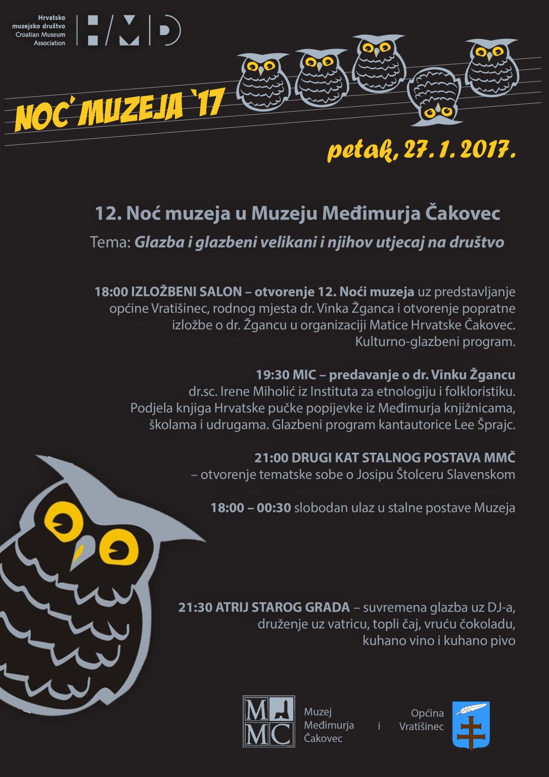 Stoga će Noć muzeja 2017. u Muzeju Međimurja Čakovec biti u znaku dr. Vinka Žganca. U predstavljanju života i djela našeg glazbenog velikana Muzej će dati prednost njegovom rodnom Vratišincu, pa će otvorenje manifestacije i prateći kulturni program biti prigoda da se istoimena međimurska općina predstavi programima i aktivnostima s kojima njeguje uspomenu i čuva glazbenu baštinu zaslužnog sumještanina. Na samom otvorenju manifestacije, u kulturnom programu sudjelovat će KUD «dr. Vinko Žganec Vratišinec», Društvo žena Gornji Kraljevec, Mješoviti pjevački zbor dr. Vinka Žganca Vratišinec i učenici OŠ dr. Vinka Žganca Vratišinec.
