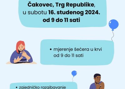 “Obilježavanje dana šećerne bolesti važno je za našu zajednicu jer dijabetes pogađa mnoge obitelji. Naš je cilj osvijestiti ljude o važnosti prevencije i podržati oboljele u svakodnevnim izazovima. Drago nam je što ćemo u centru Čakovca zajedničkim aktivnostima promovirati zdravlje i pokazati koliko je važno brinuti o sebi” rekla je Suzana Mutvar iz Udruge Međimurski slatkiš zahvalivši pritom sportskim zajednicama grada i županije što su još jednu godinu podržali njihove ciljeve. Gradsko društvo Crvenog križa Čakovec od 9 do 11 sati na Trgu Republike besplatno će mjeriti razine šećera u krvi te će građani ovim putem imati priliku provjeriti svoje zdravstveno stanje i informirati se o važnosti prevencije i kontrole dijabetesa.