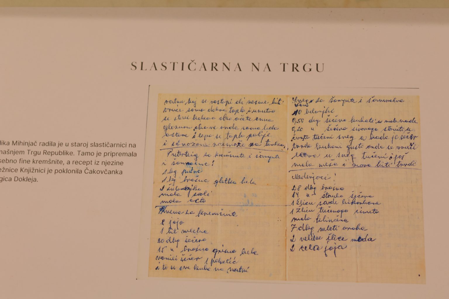 Zahvaljujući Dragici Dokleji, koja je recept donijela u čakovečku knjižnicu “Nikola Zrinski”, ova kulinarska baština je sačuvana. Recept je čak bio izložen i u zagrebačkoj knjižnici “Bogdana Ogrizovića”, a sada je poslužio kao temelj za iznimnu radionicu. Tako je oživljen recept za kremšnite koje je Julika Mihinjač pripremala još 60-ih godina prošlog stoljeća, u slastičarnici koja se nalazila na mjestu današnje Robne kuće Međimurka.