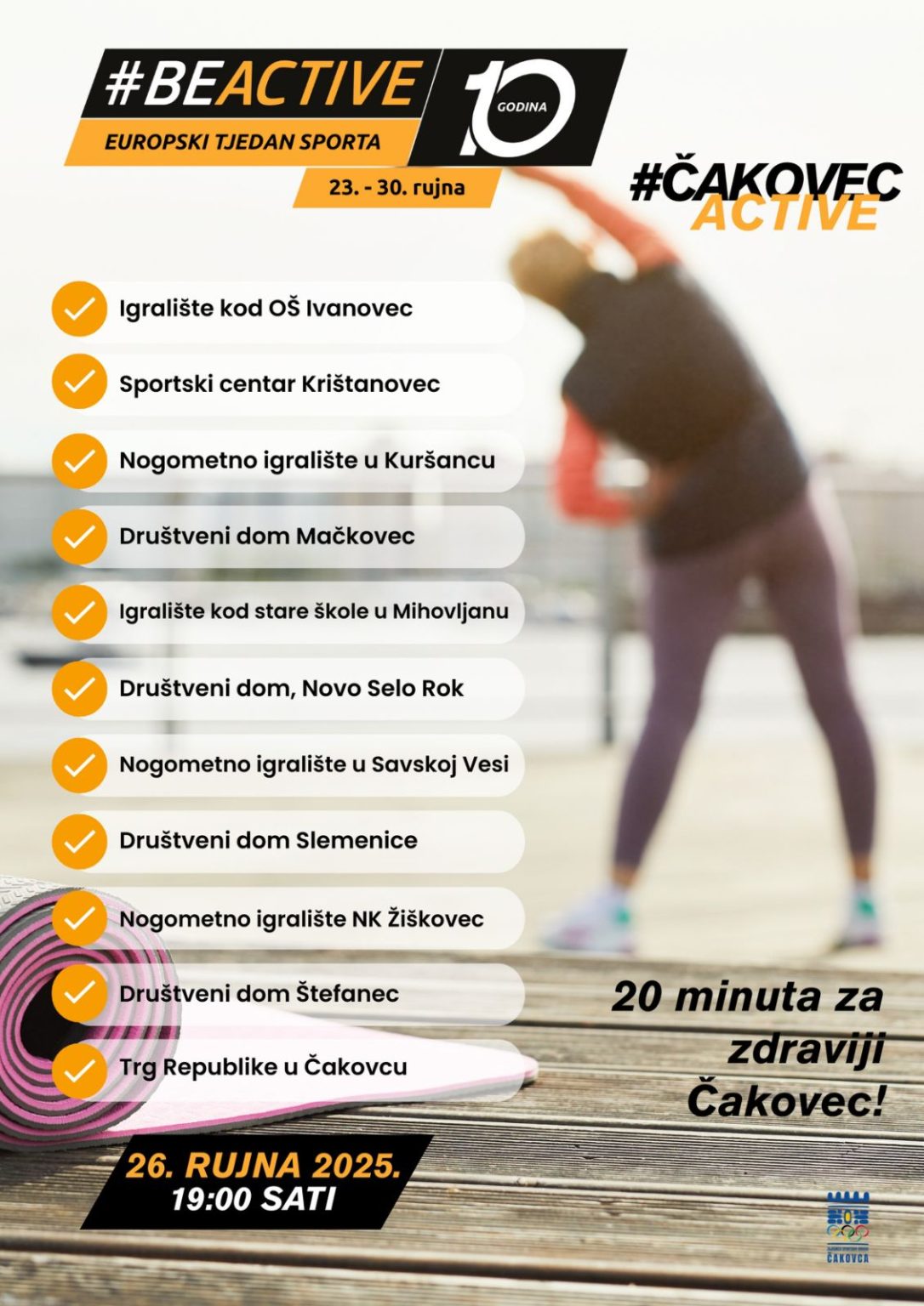 Riječ je o sportsko rekreacijskoj kampanji – „20 minuta za zdraviji Čakovec“ na koju se ovog petka 26. rujna u 19.00 sati pozivaju sportski i rekreacijski klubovi, udruge građana i svi građani, da se pridruže vježbanju na čakovečkom području u jedinstvenoj javno zdravstveno-sportskoj kampanji “ČakovecActive”.