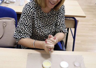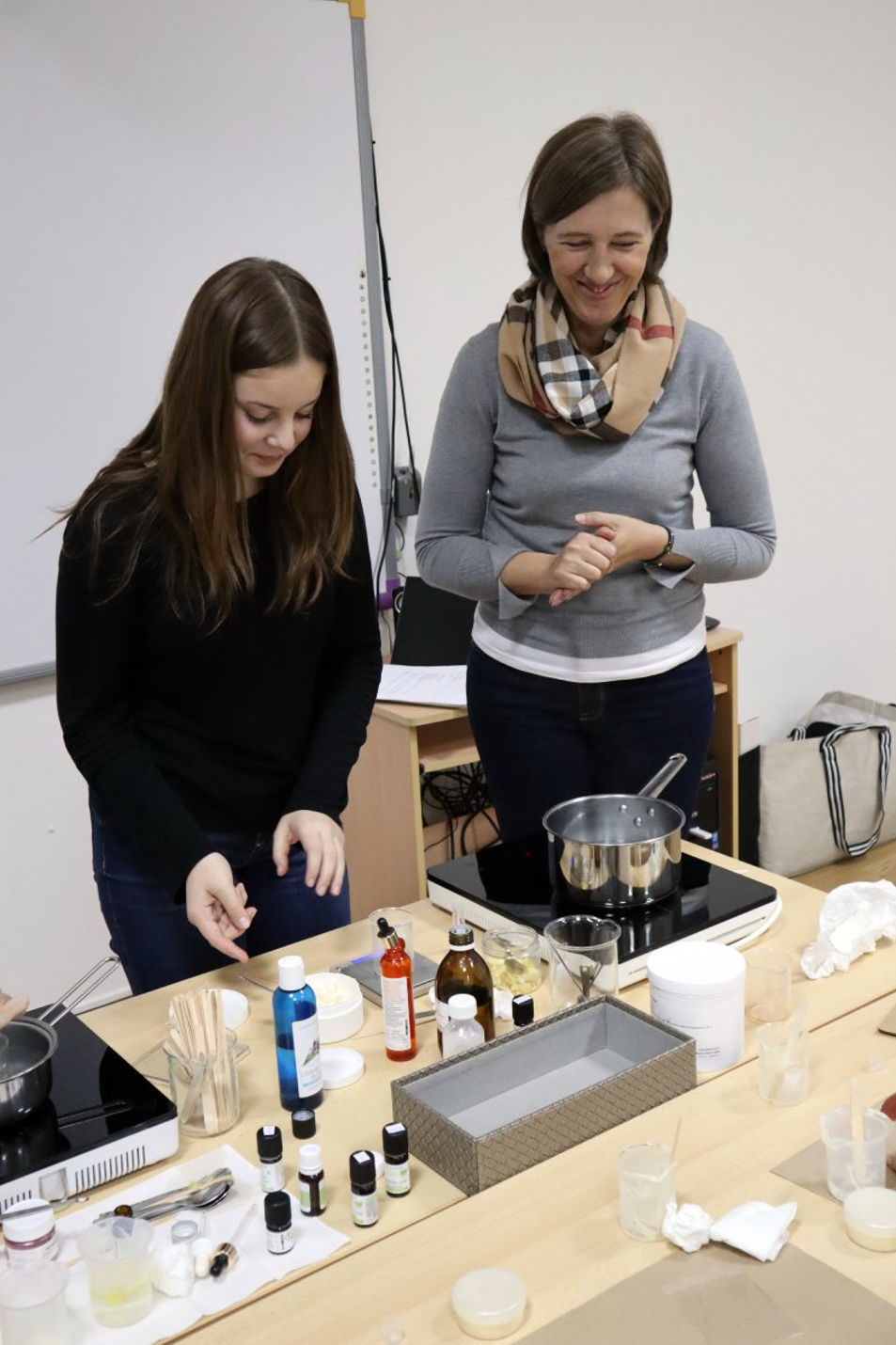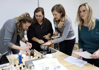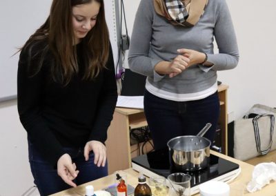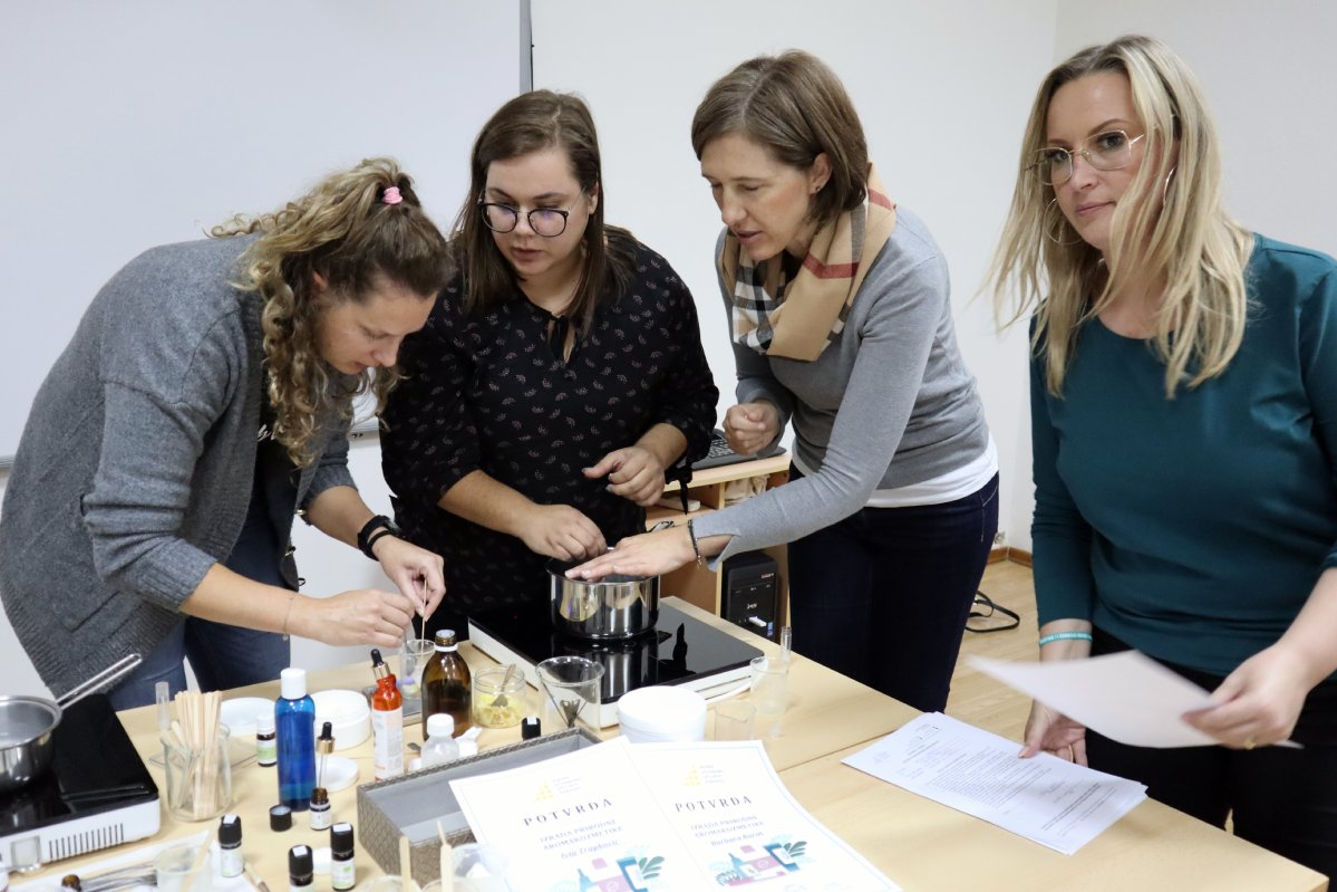 Radionica izrade prirodne aromakozmetike pod vodstvom certificirane aromaterapeutkinje Ivane Stilinović podučila je polaznice kako spraviti dva proizvoda neophodna u njezi kože tijekom zimskih mjeseci; winter zaštitni balzam za usne i winter hranjivu lanolinsku kremu za ruke. Polaznice su naučile kako koristiti prirodne sastojke kao što su hladno prešana biljna ulja, voskovi, hidrolati, botanički definirana esencijalna / eterična ulja i otkriti tajnu spravljanja vlastite prirodne zimske kozmetike koja osigurava njegu upravo onakvu kakva je koži potrebna. Komercijalna kozmetika uglavnom sadrži sastojke koji nisu srodni lipidima naše kože te nam stoga ne pružaju primjerenu njegu.