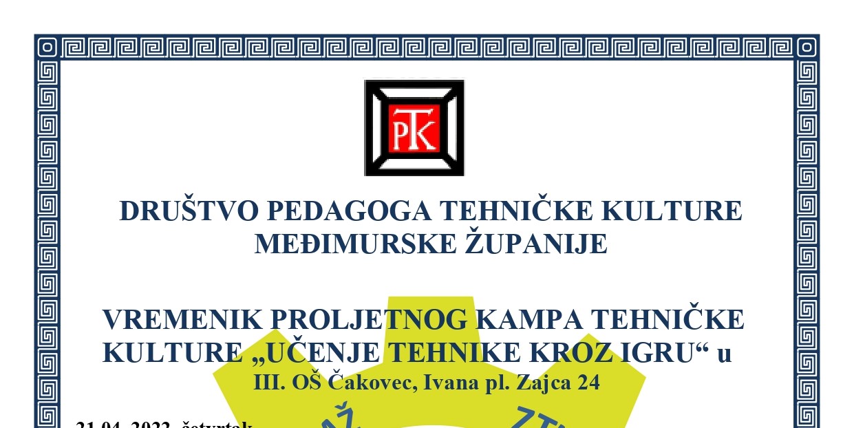 Društvo pedagoga tehničke kulture Međimurske županije će u III. OŠ Čakovec s partnerima Radio klubom „Međimurje“, Foto-kino klubom Ivanovec i Aeroklubom „Međimurje“ uz podršku Grada Čakovca i Zajednice tehničke kulture Međimurske županije održati Proljetni kamp tehničke kulture, „Učenje tehnike kroz igru“.
