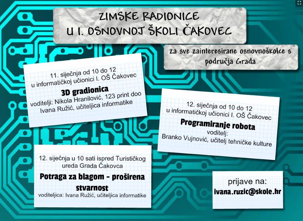Informatičke radionice održavat će se 11. i 12. siječnja 2017. u prostorima I. OŠ Čakovec te ispred Turističkog ureda Turističke zajednice Grada Čakovca, a namijenjene su učenicima osnovnih škola. Prijave se vrše na e-adresu ivana.ruzic@skole.hr.