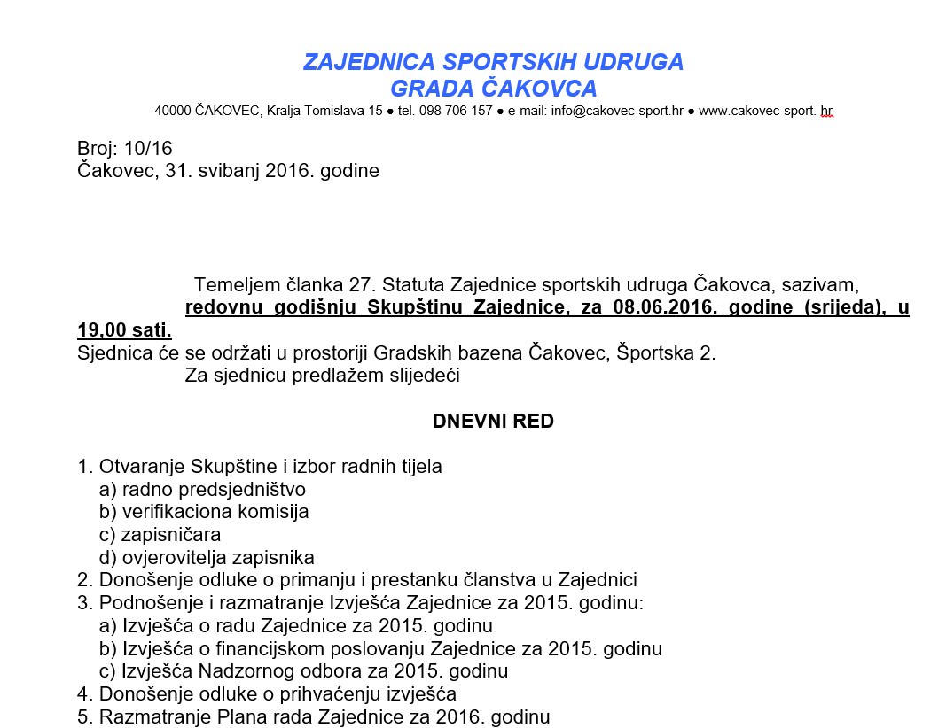 Temeljem članka 27. Statuta Zajednice sportskih udruga Čakovca, sazivam, redovnu godišnju Skupštinu Zajednice, za 08.06.2016. godine (srijeda), u 19,00 sati.