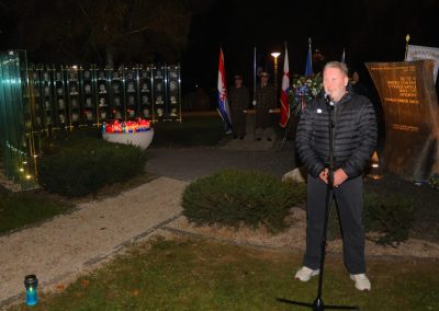 Kod spomen-obilježja poginulim i nestalim hrvatskim braniteljima u Perivoju Zrinskih obitelji i kolege poginulih branitelja evocirali su uspomene na najbliže i suborce. Na događaje u Vukovaru osvrnuo se branitelj Željko Sršan, sudionik obrane Vukovara, „Sutra je 18. studenoga, dan ponosa za našu državu, ali i posebno tužan dan za 2700 ljudi poginulih u Vukovaru, za koje će biti nošene bijele majice – svaka majica za jednog poginulog heroja. Među njima je i 11 naših dečki, pravih heroja koji su ostavili svoje živote u Vukovaru, nažalost, četvorica od njih mučki su ubijena na Ovčari. Među tih 2700 nevinih žrtava bilo je i 32 djece, i nitko do danas nije odgovarao za te strašne zločine. Puno nas je završilo u logorima, srećom, razmijenjeni smo i vraćeni svojim domovima. Prije otprilike mjesec dana pronađena je masovna grobnica u Mirkovcima. Pitam se kakvi su to ljudi koji su činili i gledali te strašne zločine? Više od 3000 hrvatskih civila prošlo je kroz logore. Kakvi su to ljudi koji su gledali kako muče starce, žene, djecu – i dan danas odbijaju reći gdje su njihova tijela. Kršćanska vjera nas uči da opraštamo. Mogu im oprostiti – ali nikada neću zaboraviti.“, kazao je Sršan.