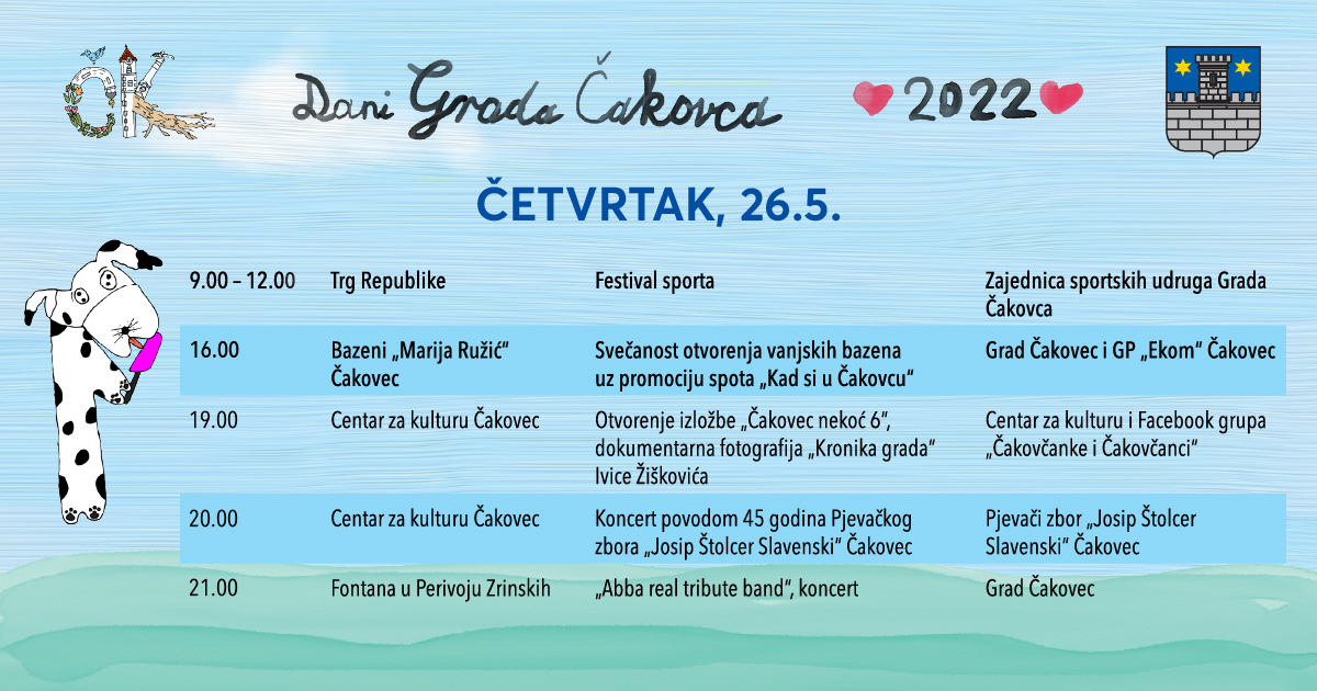 U okviru ovogodišnjeg obilježavanja Dana Grada Čakovca pripremljeno je više od 50 programa, a ljubitelji dobre glazbe pritom mogu uživati u niz glazbenih manifestacija, koncerata te nastupa i to na nekoliko lokacija. Osim u centru grada, na Franjevačkom trgu te u Centru za kulturu i atriju Starog grada, Grad Čakovec pripremio je večernje koncerte i uz dobro poznatu lokaciju fontane u Perivoju Zrinskih. Uživanje u svevremenskim hitovima u izdanju vrhunskog cover banda očekuje nas u četvrtak kada od 21 sat nastupa Abba real tribute band.