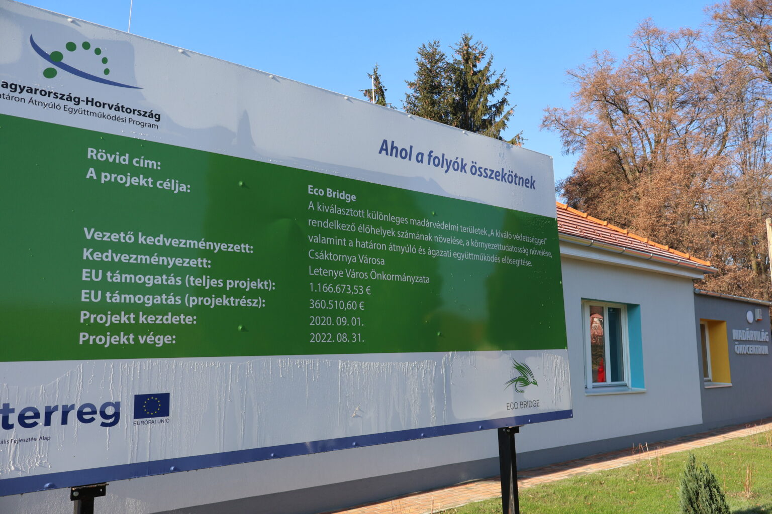 Najznačajnija mađarska investicija u okviru projekta Eco Bridge, punog naziva – Obnova ekološke raznolikosti u pograničnom području Međimurske županije i županije Zala realizirana u okviru hrvatsko-mađarskog Interreg programa Europske unije, bila je otvorenje Eko centra Svijet ptica. Svečanost otvaranja centra za posjetitelje održana je sredinom prosinca u novoobnovljenoj zgradi, koja je ovim projektom dobila svoju novu funkciju.