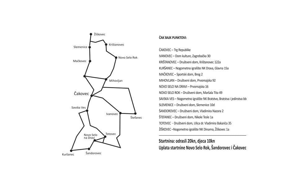 Kako je objasnio Jakopec, sudionici biciklijadu mogu započeti u bilo kojem od 14 punktova, a sami će odrediti dionice koje žele voziti. “Startnina za odrasle iznosi 20, a za djecu 10 kuna. Može se uplatiti na punktovima u Čakovcu, Novom Selu Rok i Šandorovcu, a za sve koji uplate startninu pripremili smo poklon vrećicu/torbu s oznakom biciklijade, bočicu za vodu Europske regije sporta i zdravu namirnicu – jabuku.”