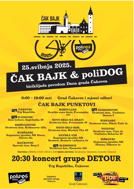 “Biciklijada se održava u nedjelju, 25. svibnja od 9 do 18 sati, i to na cijelom području Grada Čakovca. Osim punkta na Trgu Republike u Čakovcu, sudionici biciklijade moći će posjetiti 13 mjesnih odbora u sastavu Grada, gdje će se također na prigodnom punktu moći osvježiti i dobiti pečat u knjižicu. Ovo je četvrta po redu biciklijada u sklopu Dana Grada Čakovca i vjerujemo kako će se i ovaj put uključiti veliki broj Čakovčana i Međimuraca. Sav prihod od kotizacije sudionika ove godine ide za potrebe Udruge za sindrom Down Međimurske županije. Želim svima ugodnu vožnju kroz naš predivan Čakovec“, rekla je gradonačelnica Cividini.