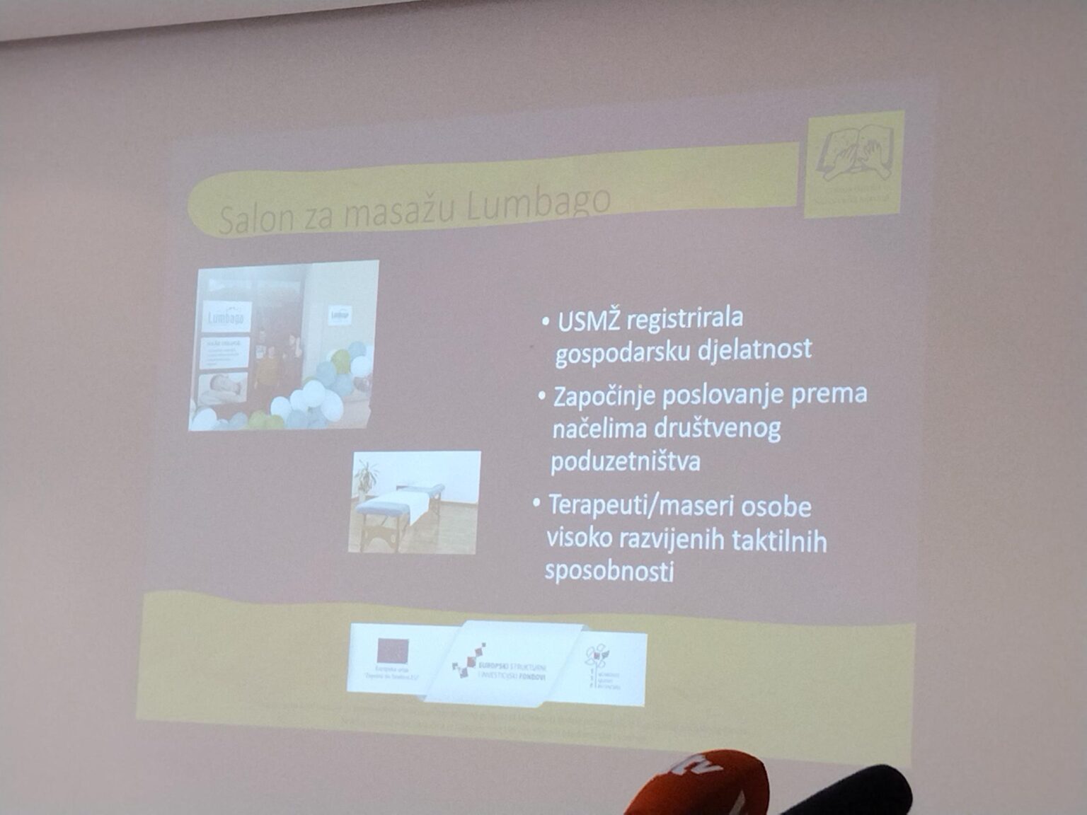 Projekt je financiran iz Europskog socijalnog fonda u sklopu Operativnog programa „Učinkoviti ljudski potencijali“ 2014. – 2020., ukupne vrijednosti više od 600 tisuća kuna, a predviđeno trajanje projekta je 18 mjeseci. U sklopu projekta “Razvoj društvenog poduzetništva za slijepe osobe” od 7. svibnja 2022. godine započinje sa radom salon za masažu “Lumbago” čiji osnivač, Udruga slijepih Međimurske županije, omogućuje zapošljavanje slijepih osoba.