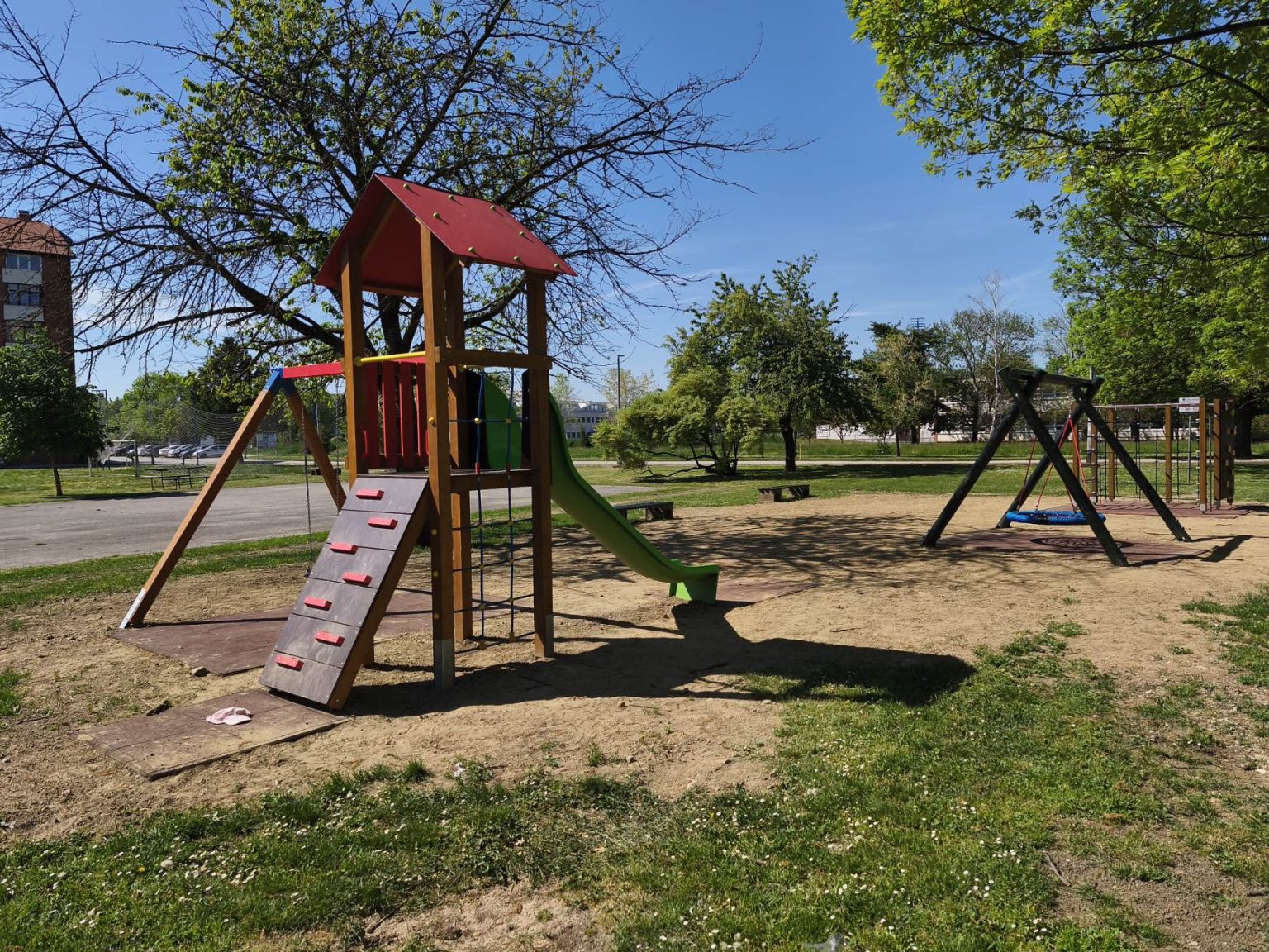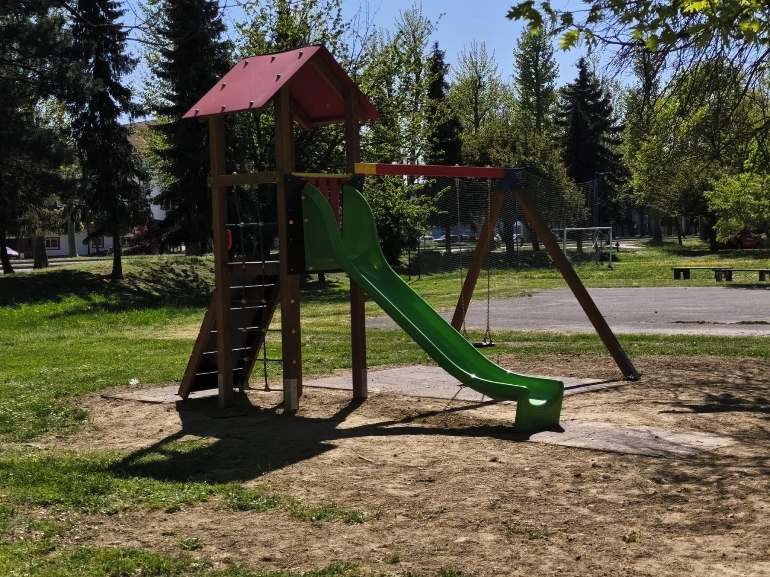 Novim projektom postavljeno je drveno kombinirano igralo, koje se sastoji od samostojeće kućice na koju se oslanja ravni tobogan.